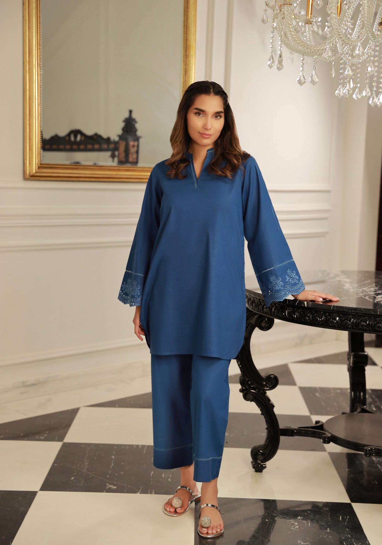 “Azure” is a captivating ethnic-themed “IKAT” printed Co-ord outfit. features a double-placket kameez that adds a touch of sophistication, while the stylish cuff sleeves and matching culottes exude effortless comfort, Shop Sahar’s “IKAT” co-ord today and add a touch of ethnic charm to your everyday wardrobe!”