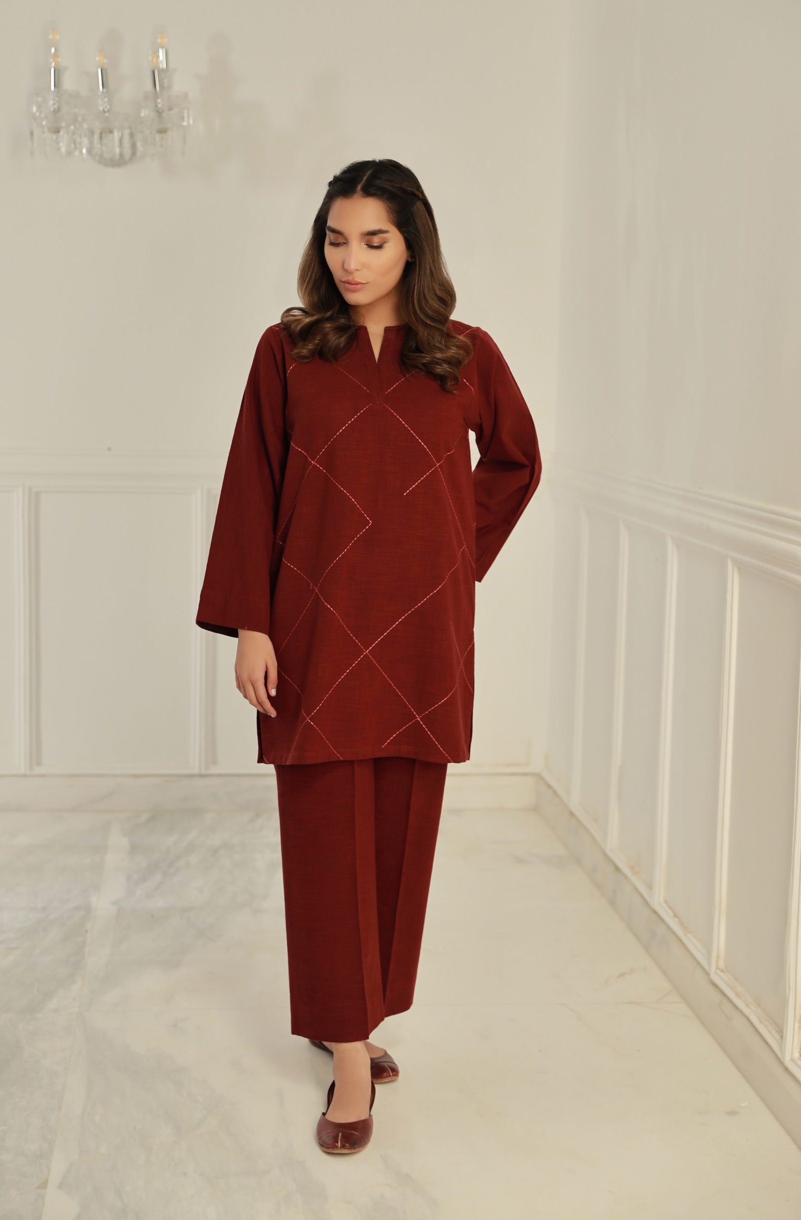 Rosewood redefines casual with their captivating deep-maroon co-ord. This modern duo features a mesmerizing diamond-shaped stitch pattern that adorns the shirt, adding a touch of visual intrigue. Flared sleeves and breezy culottes complete the look, making it perfect for effortless elegance from desk to dinner.