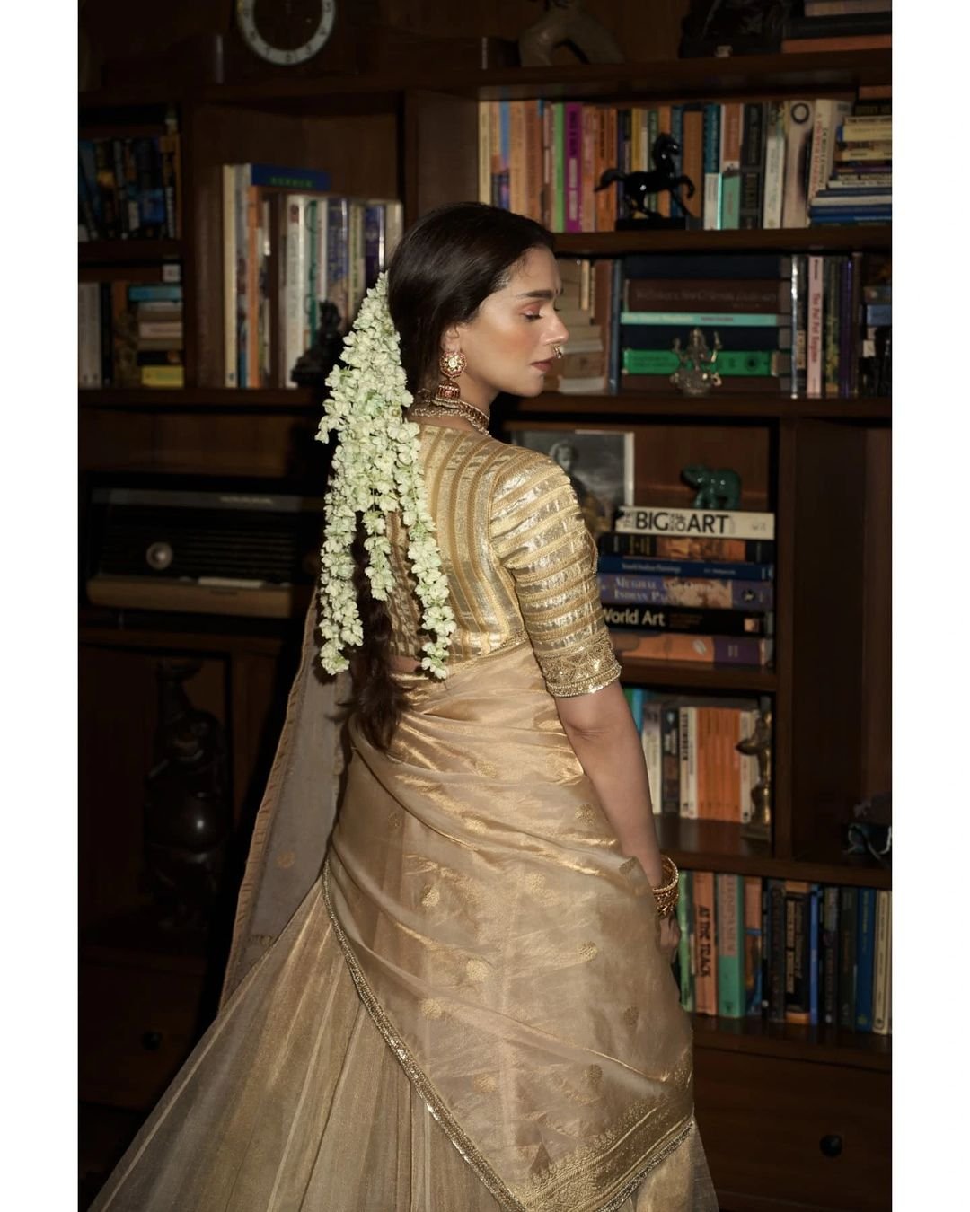 Aditi Rao Hydari has always been known for her ethereal beauty and impeccable style, but her recent look has brought a classic element back into the spotlight—the traditional mogra gajra. Wearing an elegant gold saree, Aditi styled her open hair with the fragrant floral accessory, adding a touch of timeless grace to her modern attire.