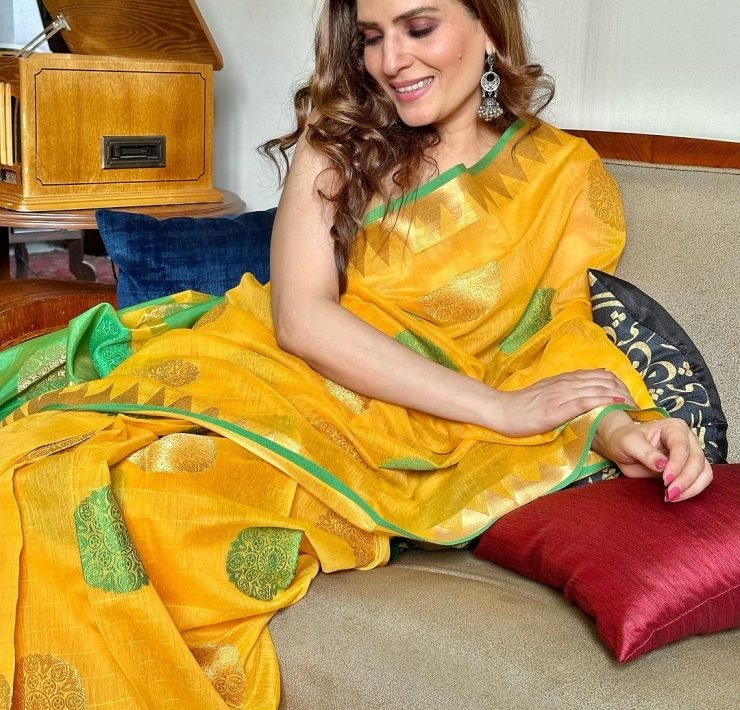 Sadaf Kanwal is a sight to behold in a gold banarsi saree at a recent family wedding. Sadaf and sarees are a beautiful combination as the gorgeous model knows how to carry them with grace! She styles the saree with exquisite jewelry from Neemar Jewels that compliments the overall look. There is a thing about sarees and weddings as it is a timeless piece of clothing that you can repeat numerous times with different blouses and look beautiful at weddings. Gold looks royal at day weddings and Sadaf gives us the inspiration to style vintage banarsi pieces in the winter season. With minimal hair and makeup and letting the outfit speak for itself, Sadaf Kanwal becomes one of our best-dressed celebrities!
