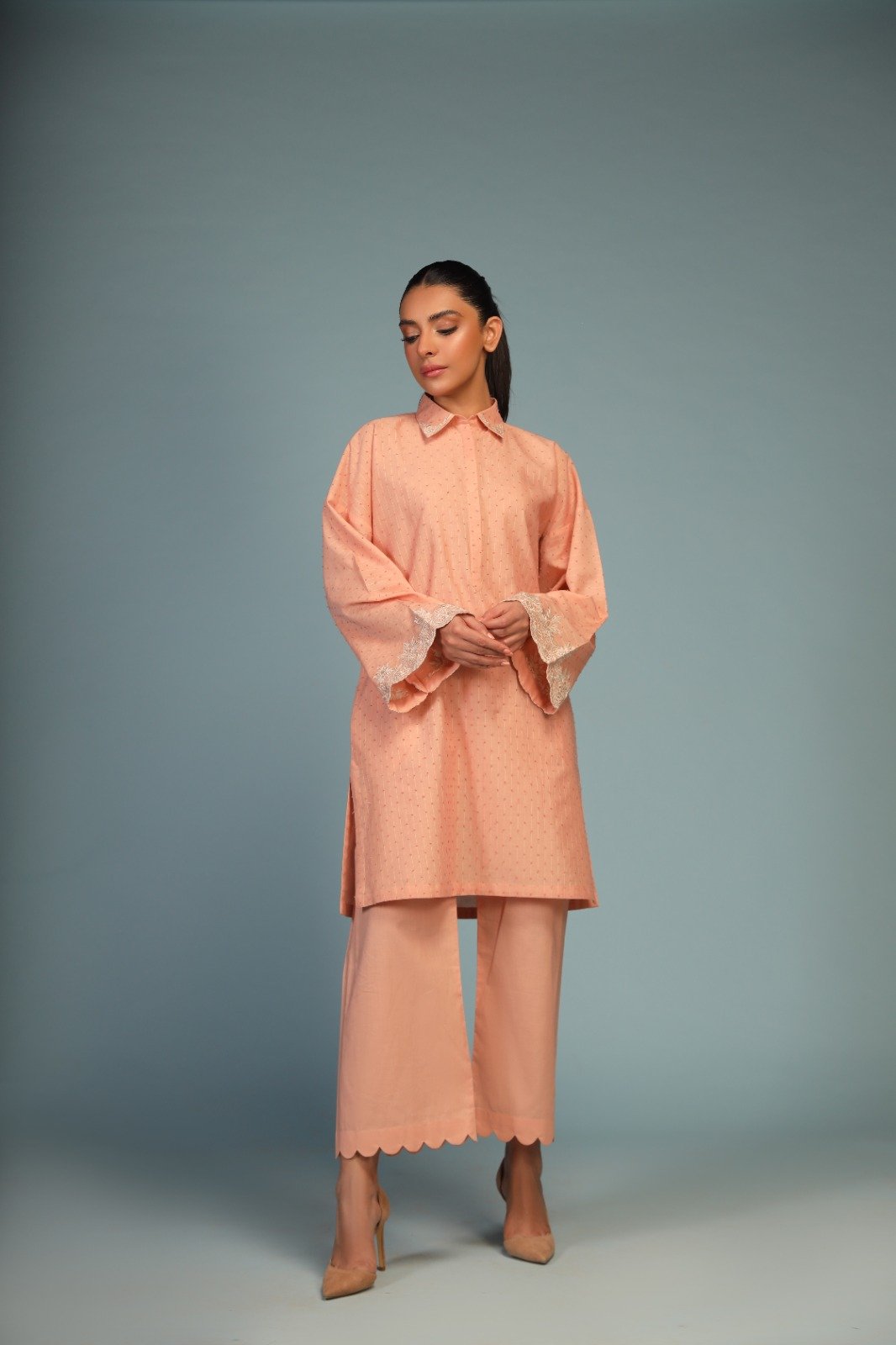 Discover our exquisite peach-coloured 2-piece, graced with stunning floral embroidery in an elegant off-white hue. The spread collar and bell-bottom sleeve edges are adorned with this intricate floral detailing, adding a touch of timeless beauty to the ensemble.