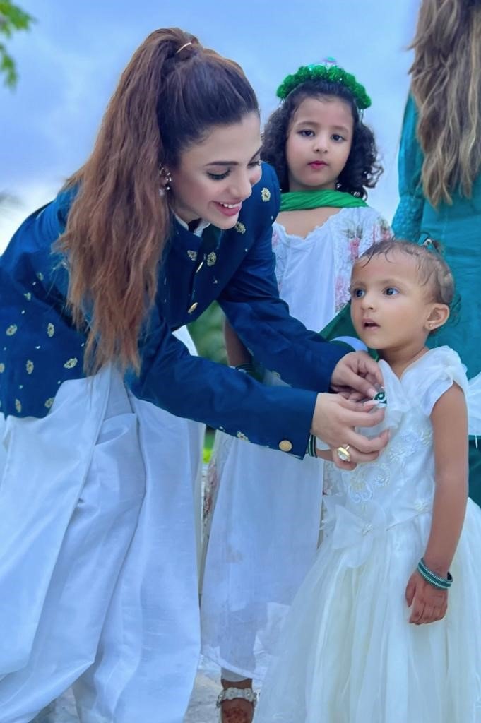 Among the stars who wore the outfits were notable names such as Sonya Hussyn, Sidra Iqbal, Sharmila Faruqi, Natasha Baig, Hajra Yamin, Shazia Naz, Pheby Haroon, Fatima Hasan, Aneela Murtaza and Nida Yasir amongst others. The all-white, button-down sherwani looked super sophisticated. While Sonya Hussyn put on a statement jacket over her sherwani, Natasha Baig opted to style up her suit with a belt. Others wore bold jewelry and pinned flags to highlight their own personality.