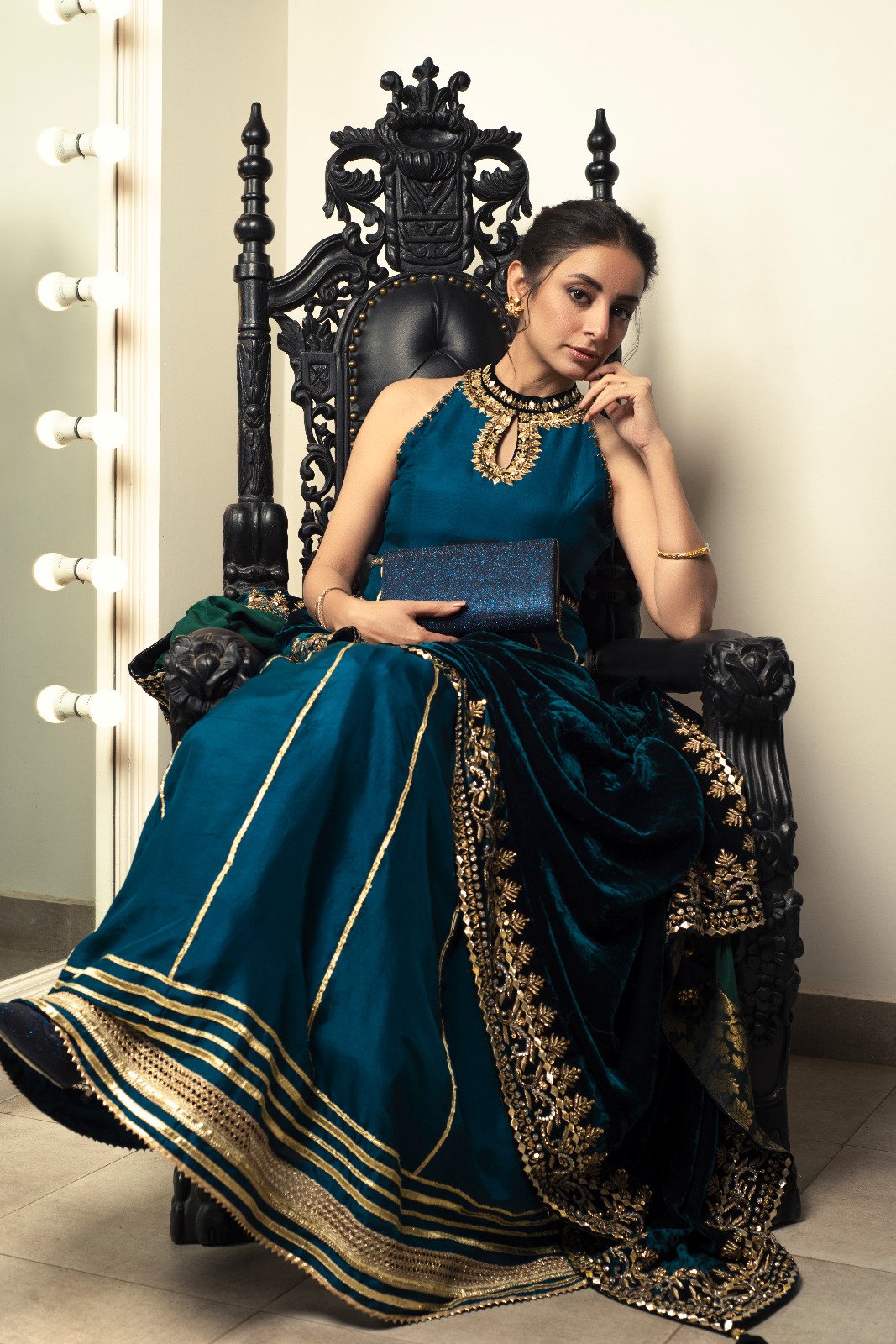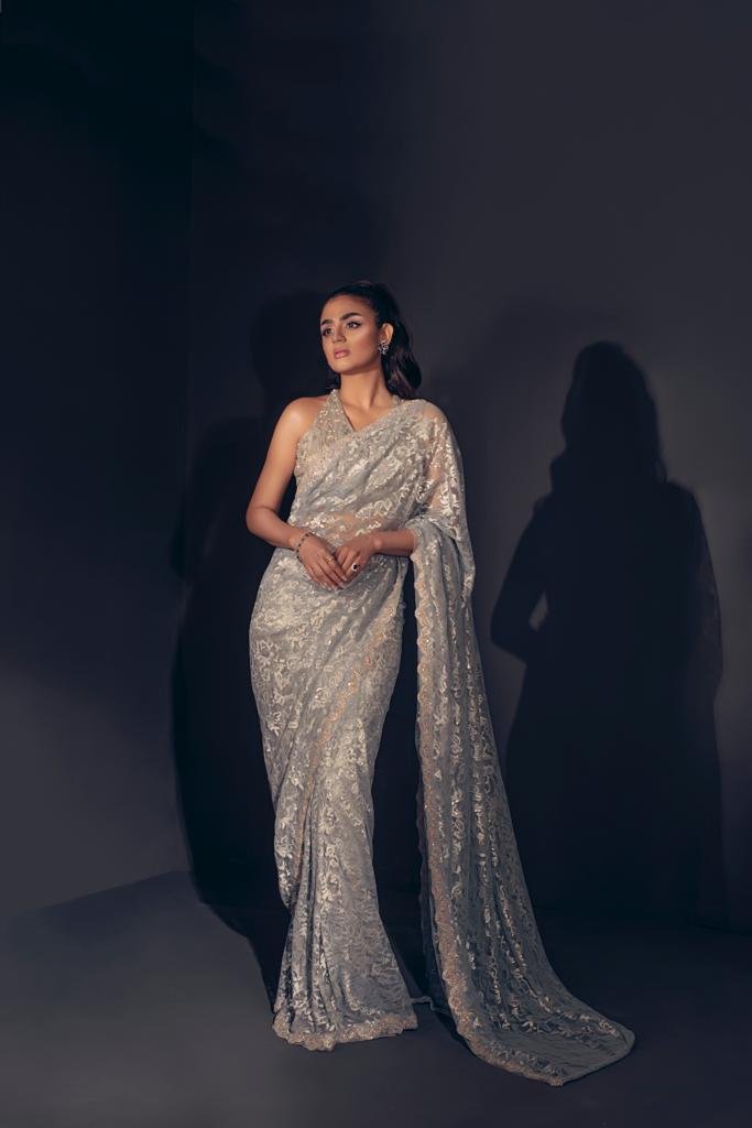 Mariyam D. Rizwans brand has only grown exponentially since it first began in 2015. In 2022, we saw her collections range from luxury pret, ready-to-wear, luxury formals, and so much more. However, her collections ‘Jhoom’ (worn by Sadaf Kanwal and Fouzia Aman) and ‘Ceyda’ (worn by Ayesha Chundrigar) have been among the favorites of many established names in the industry. Mariyam D. Rizwan particularly stole the spotlight last Eid and Independence day, with famous names wearing her ensembles including fashion icons such as Ayeza Khan, Sonya Hussyn, and Sadaf Kanwal to name a few. However, one outfit that couldn’t be missed was a black and silver ensemble worn by Saba Qamar for the promotion of her film ‘Kamli’.