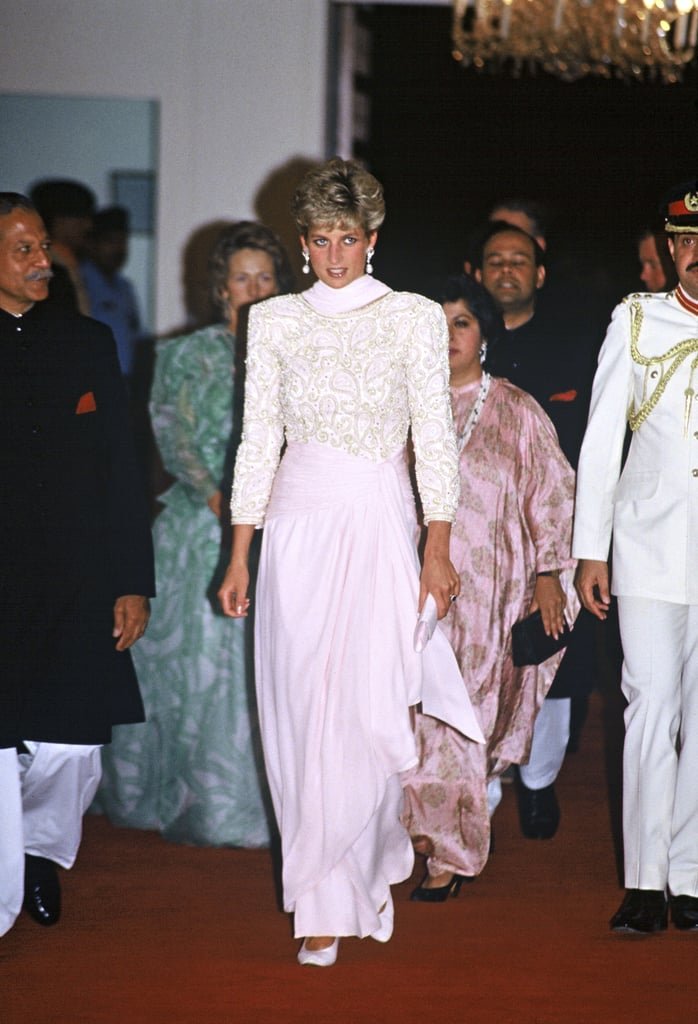 Blush pink with a beaded bodice, Princess Diana attends a reception in her honour in Pakistan in 1991.