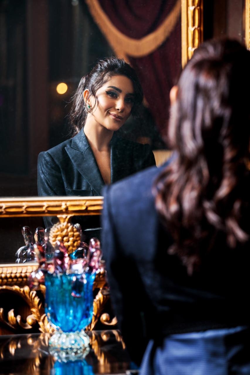 Rocking the “looking in the mirror” portrait, Sohai Ali’s personality oozes through her own reflection, as she stands in a perfectly tailored pant suit by UJ Bespoke.