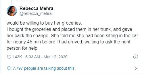 “I know it’s a time of hysteria and nerves, but offer to help anyone you can. Not everyone has people to turn to,” Rebecca Mehra said in her post. It’s so heartwarming to see how even during a pandemic, people aren’t afraid to do these little acts of kindness.