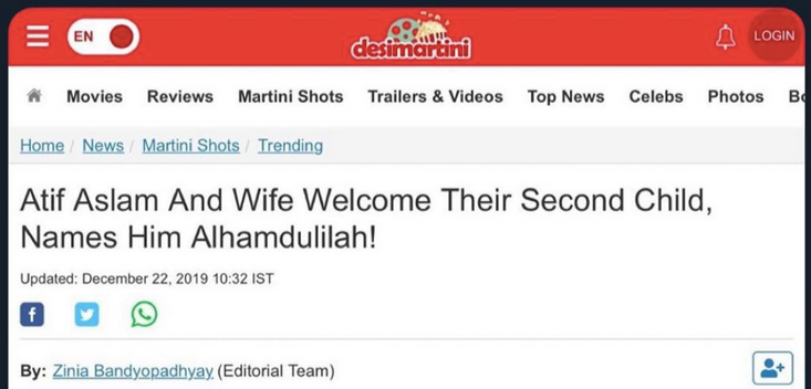 We cannot stop laughing. The website mistook Atif Aslam’s post thanking Allah for his baby and wife’s health by saying ‘Alhamdullilah’ for Atif Aslam naming his baby ‘Alhamdullilah.’ Ever heard of fact checking? Or umm we don’t know, common sense?