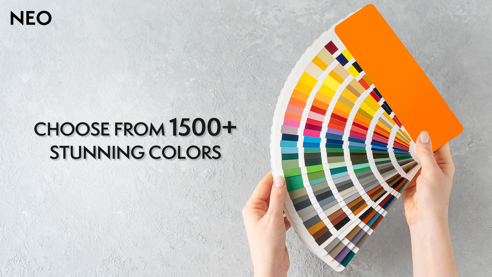 NEO offers over 1500 colours to choose from, including neutrals, bolds, and brights. There’s something to suit every vibe. To guide your choice, consider your space. Would it benefit from a bold colour or would a neutral be better. Do you envision a calm and relaxing feel or something bright and breezy? Once you have a direction you can start sifting through shade cards and make your decision.