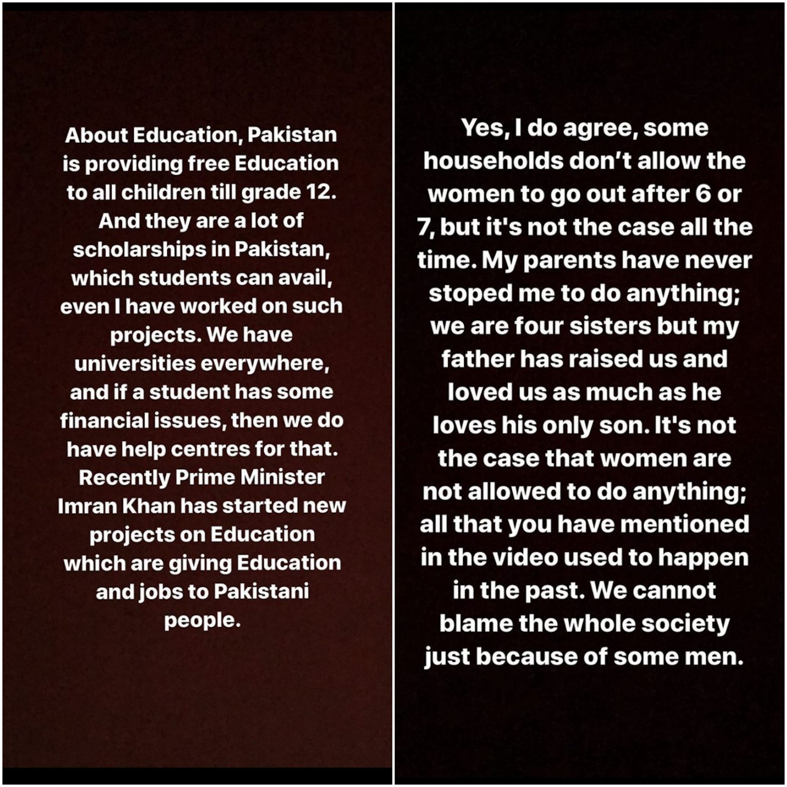 While we’re not ones to set the example of gender equality and equal representation, what country is? Countries in the West are still struggling to this day when it comes to equality. Claiming every woman in Pakistan is not allowed to go out in the evenings, isn’t allowed to receive an education, isn’t allowed to be financially independent, is incorrect and far from the truth. While Alyne’s video may be well intentioned, someone with as much influence as her should be more responsible with the content they’re producing and the stereotypes they are cementing about our beautiful country, Pakistan.