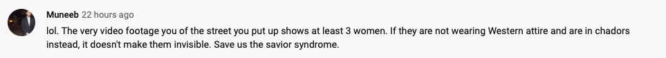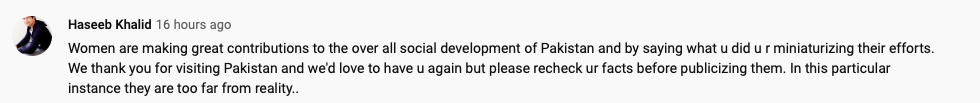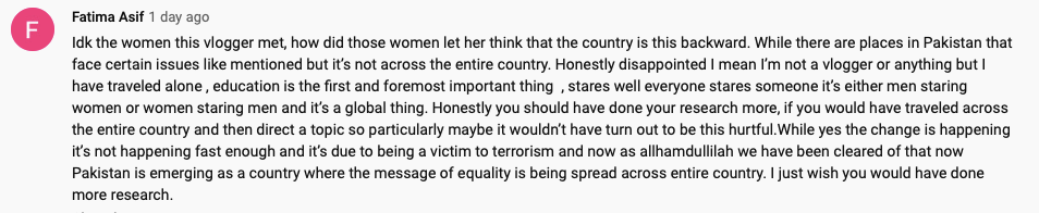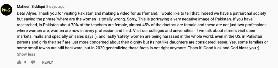 Only 5 women were featured in her video, and Alyne Tamir decided that’s a big enough number to properly assess the unique and complicated issues of Pakistan. By only highlighting one side of the equation, Alyne has discredited the efforts made by generations of Pakistani women and the strides they have made towards gender equality. And the comments underneath her video suggest the same: