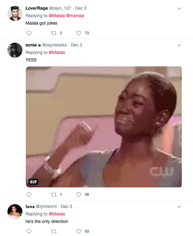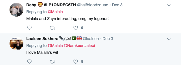 Zayn’s post prompted Malala to respond on twitter with the puns of all puns, the dad jokes to end all dad jokes: