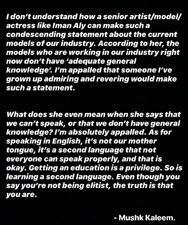 Mushk was disappointed to hear such statements from a model like Iman Aly who she grew up admiring. Mushk concluded by saying, “Even though you say you are not being elitist, the truth is you are.”