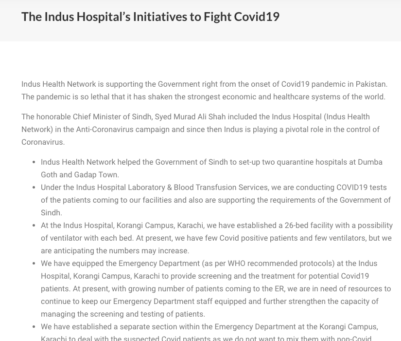 The Indus Hospital is working hand in hand with Sindh Government to screen and treat COVID-19 patients free of cost. They can achieve all the things mentioned above because of YOUR donations and they need them now more than ever.