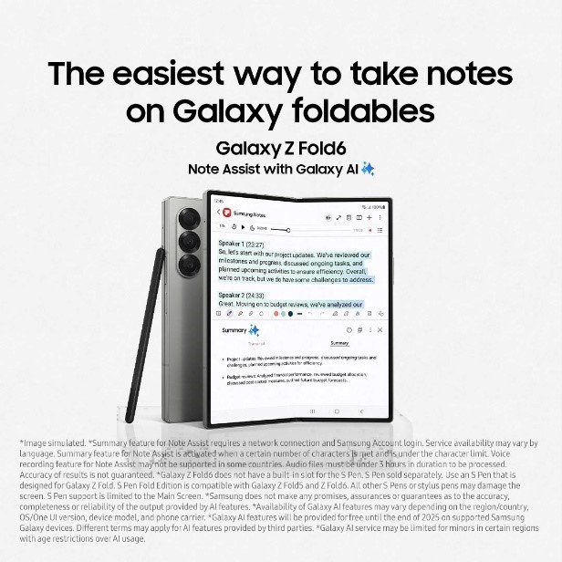 [5] Features for Note Assist require a network connection and Samsung Account login. Service availability may vary by language. Voice recording feature in the Samsung Notes app may not be supported in some countries. Summarizing feature is activated when a certain number of characters is met and is under the character limit. Audio files must be under 3 hours in duration to be processed. Accuracy of results is not guaranteed.