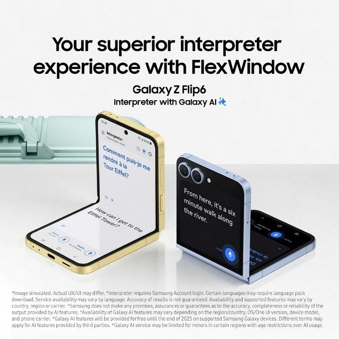 [29] Audio interpretation is only available when wearing Buds and connected to a Samsung Galaxy smartphone. Interpreter feature is not directly provided by Buds themselves. If Buds are unavailable, the interpreted content is provided on the screen of your Samsung Galaxy smartphone. Certain languages may require language pack download. Service availability may vary by language, country, region or carrier. Samsung Galaxy devices may require the latest software update to properly support Galaxy AI features.