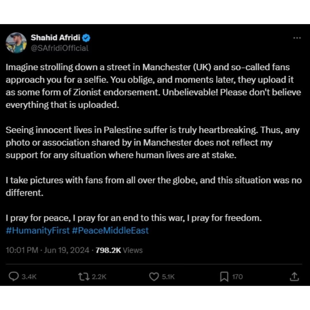 Taking to X (formerly Twitter) after the photo went viral, Afridi said that he was walking down a street in the UK when some people asked him for a photo and he obliged, reiterating his support for muslims and Palestine and calling out the horrors being practiced in Israel.