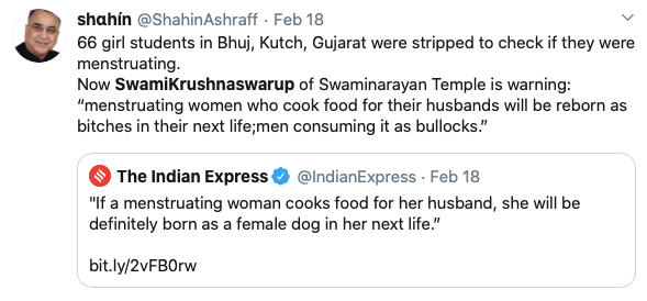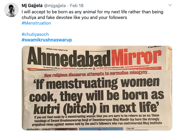 In a video of one of his lectures, ‘Swami Krushnaswarup Dasji’ of the Swaminarayan Bhuj Mandir can be seen telling his followers that a menstruating woman who cooks food for her husband will be reborn as a “kutri” (bitch). During the lecture delivered in Gujarati, he goes even further to claim that these “rules” have been outlined in the shastras and he refrained from telling his followers about them over the last decade since he was cautioned not to “reveal the secrets of the religion”.