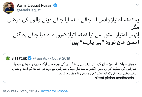 جا دو پَروں میں بانٹ دیا تجھے” pic.twitter.com/iirYos1dC1— Aamir Liaquat Husain (@AamirLiaquat) January 27, 2020