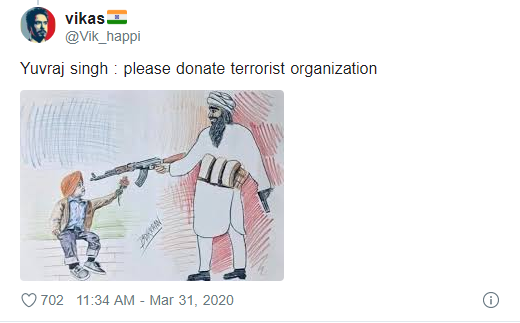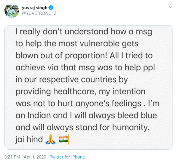 — yuvraj singh (@YUVSTRONG12) March 31, 2020