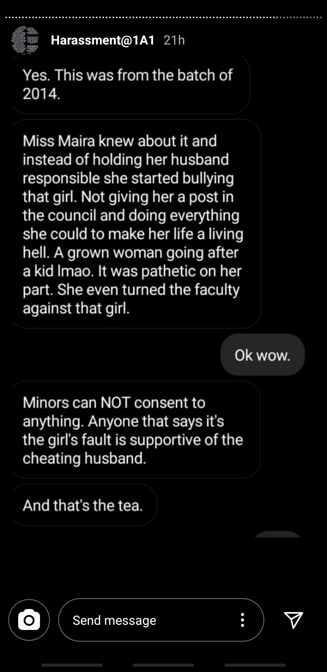 So @omairana’s wife Maira Omair Rana has been slut-shaming girls and silencing them since years over being harassed by the male faculty of LGS 1A1. This woman continues to preach “morals” and “ethics” while being a deeply rooted cause of the problem along with Rubina Shakeel 1/2