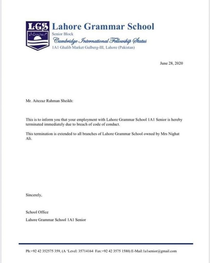 Aitezaz Rehman Sheikh,Zahid Warraich, Umer Sharif and Shehzad Irshad have been terminated from their positions at LGS 1-A1, after 4 years of complaints against them, while allegations against Omair Rana are also present. It seems the school only deemed it fit to take action after the matter was brought to the worlds attention via social media.