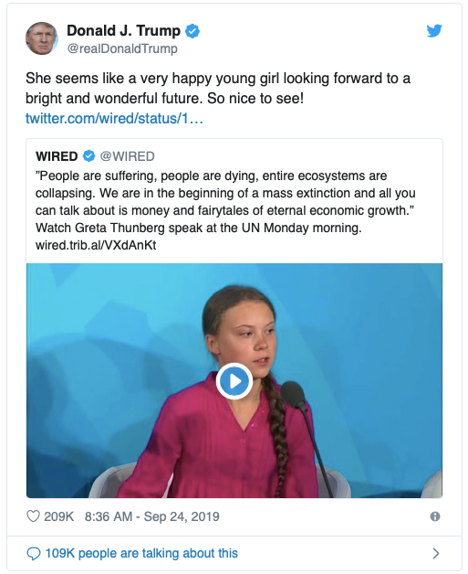 Later, Trump took to Twitter and described Greta as a “ happy, young girl looking forward to a bright and wonderful future”, which has caused massive backlash against the President (surprise, surprise).