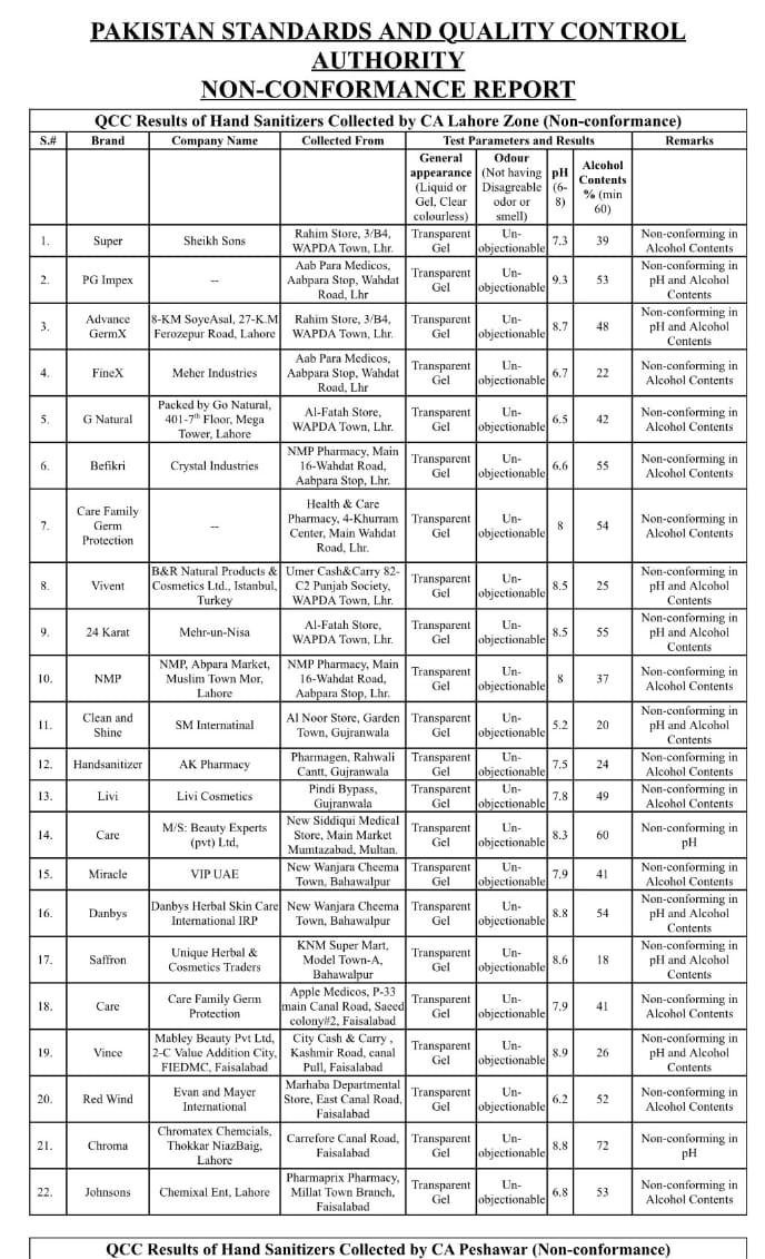 On Friday, Minister for Science and Technology, Chaudhry Fawad Hussain shared a list of hand sanitisers that do NOT meet international standards. Fawad said Pakistan Standards and Quality Control Authority collected samples of 23 brands and after testing, it concluded that they are not in conformity with the quality benchmarks set by the World Health Organisation. As a result, the government has order for their immediate removal from the stores: “We have advised the health authorities to remove them from stores,” the minister said.