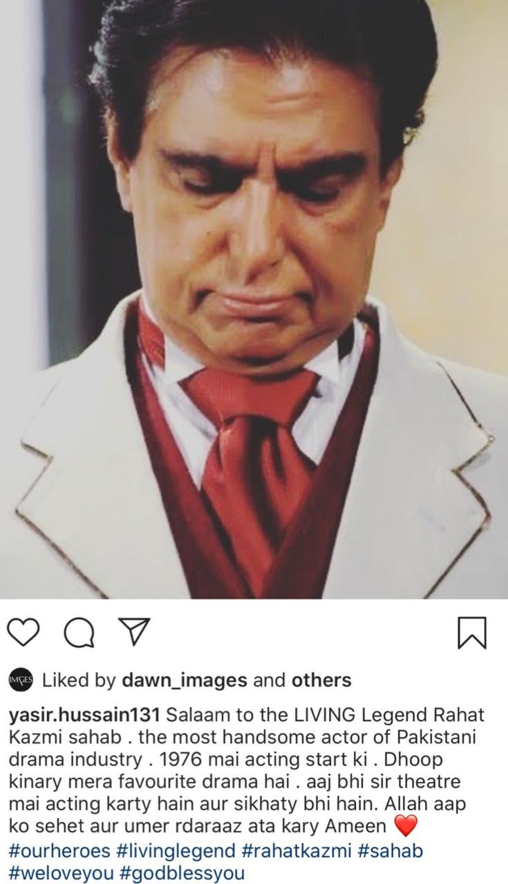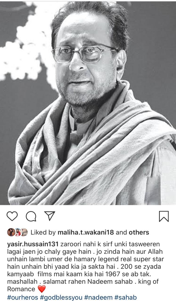 Following these posts, Yasir Hussain began a series of pictures that aimed to honour Pakistan’s living legends, saying “ Zaroori nahi k sirf unki tasweeren lagai jaen jo chaly gaye hain . jo zinda hain aur Allah unhain lambi umer de hamary legend real super star hain unhain bhi yaad kia ja sakta hai.” This included Nadeem Baig, Rahat Kazmi and Bushra Ansari: